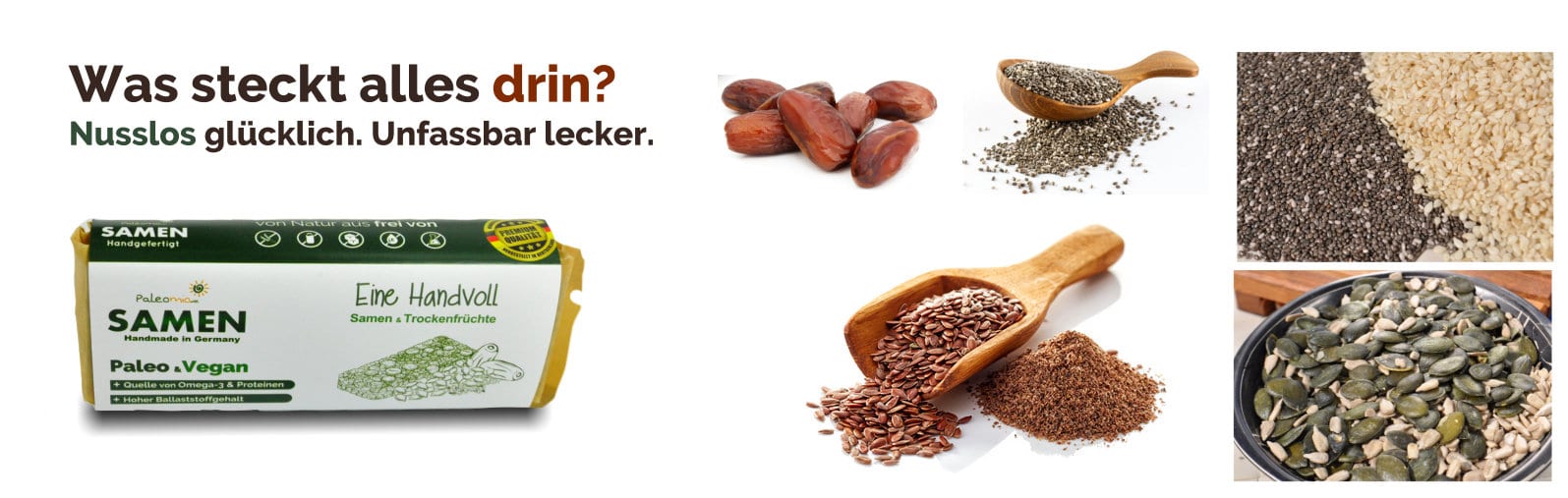 Datteln, Sonnenblumenkerne, Sesamsamen, Kürbiskerne, Chiasamen (Salvia hispanica 5%), Leinsamen – sonst nichts.